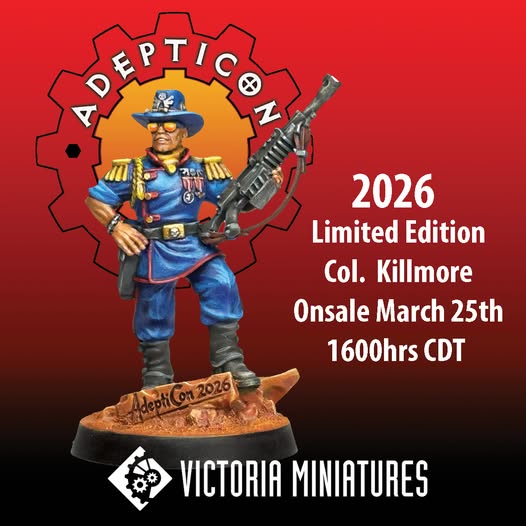 I am thrilled to reveal Col. Killmore as the AdeptiCon 2026 Official Limited Edition Sci-Fi Miniature. Thanks to the AdeptiCon organizers, 200 minis have been made available to Victoria Miniatures online customers. Sale will will go live at VictoriaMiniatures.com at 4pm March 25th. This year, this physical miniature also includes a free STL digital variant. Cheers, V